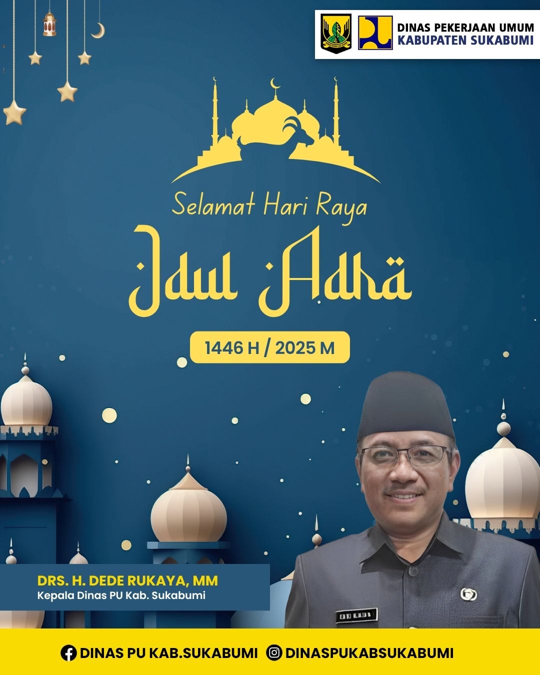 Kepala Dinas Pekerjaan Umum Kabupaten Sukabumi Drs. H. Dede Rukaya, MM. Menyampaikan Selamat Hari Raya Idul Adha 1446 Hijriah! Semoga keberkahan senantiasa menyertai kita semua, menguatkan langkah dalam membangun daerah yang lebih baik dan sejahtera Sukabumi Mubarokah.