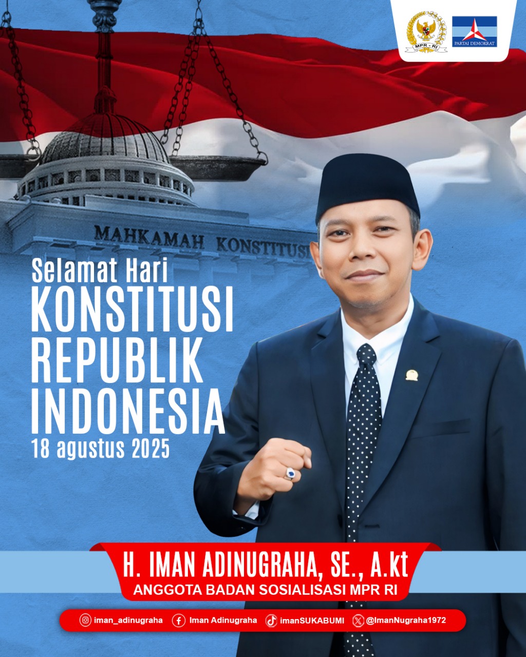 Sukabumi,- Dalam rangka memperingati Hari Konstitusi Republik Indonesia, Iman Adinugraha, Anggota DPR RI Komisi VII Fraksi Demokrat sekaligus Anggota Badan Sosialisasi MPR RI, menyampaikan pesan penting tentang peran konstitusi sebagai fondasi pembangunan industri nasional, pemberdayaan UMKM, dan penguatan ekonomi kreatif yang berkarakter kebangsaan.