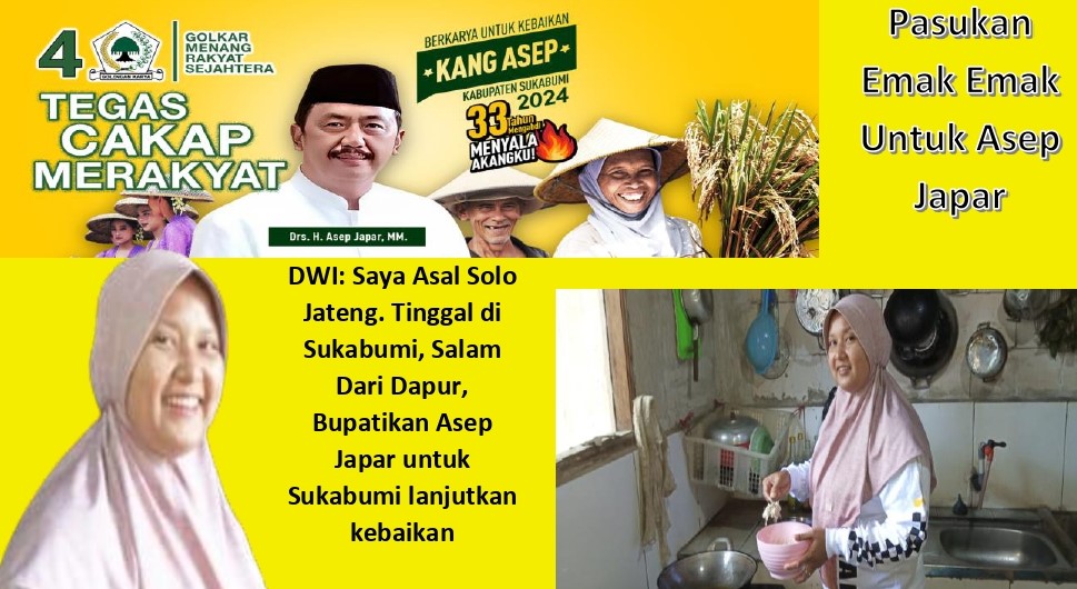 “Ajak keluarga terdekat, ajak tetangga kiri kanan, ajak teman dan kolega, mari satukan suara untuk Asep Japar lanjutkan kebaikan untuk kabupaten Sukabumi. Sekali lagi Bupatikan Asep Japar di Pilkada Kabupaten Sukabumi 2024 ini. Saya Asal Solo Jateng Tinggal di Sukabumi, Salam Dari Dapur, Bupatikan Asep Japar untuk Sukabumi lanjutkan kebaikan,” ungkapannya.