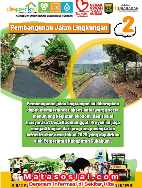 Matasosial.com, – Pemerintah Kabupaten Sukabumi melalui Dinas Perumahan dan Kawasan Permukiman (PERKIM) terus mendorong pemerataan pembangunan infrastruktur desa. Salah satu wujud nyata komitmen tersebut tampak dalam pelaksanaan pembangunan jalan lingkungan di Kampung Kebonjati RT 005/005, Desa Kadununggal, Kecamatan Kalapanunggal.