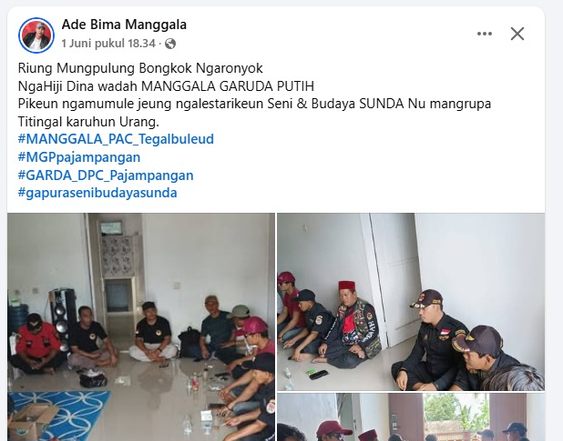Sukabumimubarokah.id, – Pada tanggal 1 Juni 2025, akun media sosial Ade Bima Manggala membagikan sebuah unggahan yang menggambarkan semangat kebersamaan dan kecintaan terhadap budaya Sunda. Dalam unggahannya, ia menekankan pentingnya Riung Mungpulung Bongkok Ngaronyok—semangat berkumpul dan bersatu dalam wadah Manggala Garuda Putih, demi menjaga dan melestarikan warisan seni dan budaya yang telah diwariskan oleh para leluhur. Rabu 04 Juni 2025.