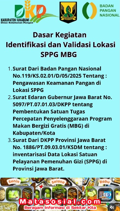 Matasosial.com, – Sukabumi, Oktober 2025 — Dalam semangat Sukabumi Mubarokah yang menjunjung nilai Maju, Unggul, Berbudaya, dan Berkah, Dinas Ketahanan Pangan Kabupaten Sukabumi terus memperkuat komitmennya terhadap keamanan pangan masyarakat. Salah satu langkah nyata dilakukan melalui kegiatan Identifikasi dan Validasi Lokasi Dapur SPPG MBG, yang dilaksanakan oleh Tim OKKPD Kabupaten Sukabumi pada minggu lalu.