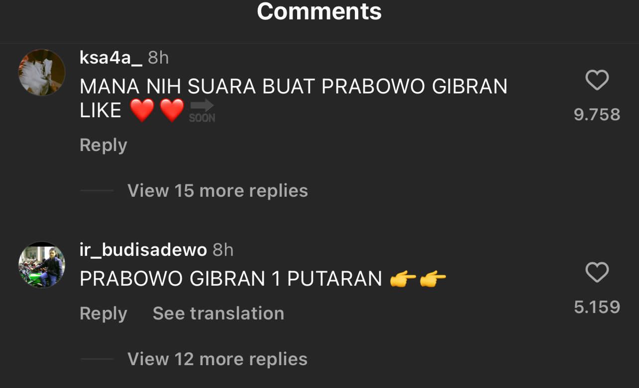 “Prabowo satu putaran,” ucap @ir_budisadewo. “MANA NIH SUARA BUAT PRABOWO GIBRAN LIKE,” tambah akun @ksa4a_.