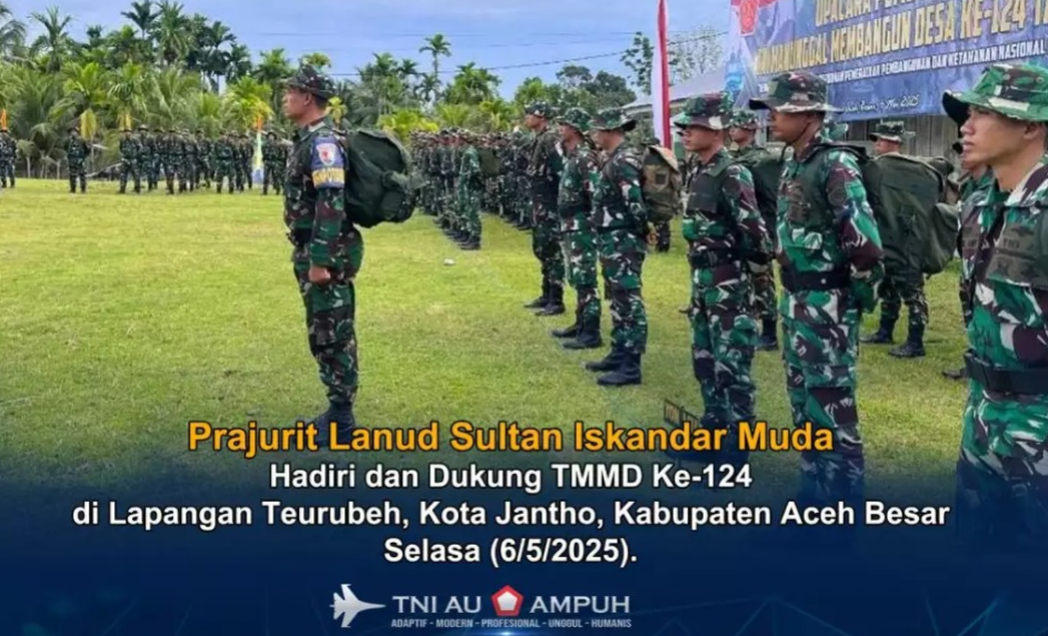 TNI AU. Kepala Dinas Operasi (Kadisops) Lanud Sultan Iskandar Muda (SIM), Letkol Pas April Brahmana, S.Pd., bersama Kepala Dinas Personel (Kadispers) Lanud SIM, Letkol Adm Abdul Latief, S.Ag., menghadiri Upacara Pembukaan TNI Manunggal Membangun Desa (TMMD) ke-124 Tahun 2025 di Lapangan Teurubeh, Kota Jantho, Kabupaten Aceh Besar, Selasa (6/5/2025). Keduanya hadir mewakili Komandan Lanud SIM, Kolonel Pnb Hantarno Edi Sasmoyo, M.Han.