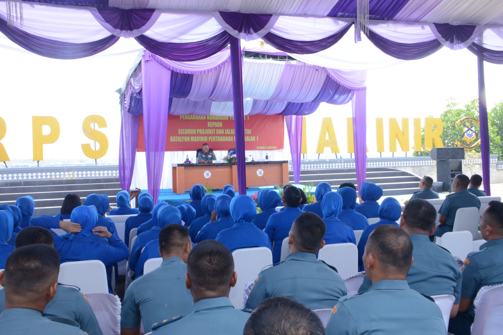 menerima pengarahan Komandan Pasmar 1 Brigjen TNI (Mar) Umar Farouq, S.A.P., CHRMP., M.Tr.Opsla., M.Han., dan Ketua Koordinator Cabang Pasmar 1 Ny. Atik Umar Farouq di Mako Yonmarhanlan l, Jalan Serma Hanafiah No. 01 Belawan, Sumatera Utara Senin (22/7/2024).