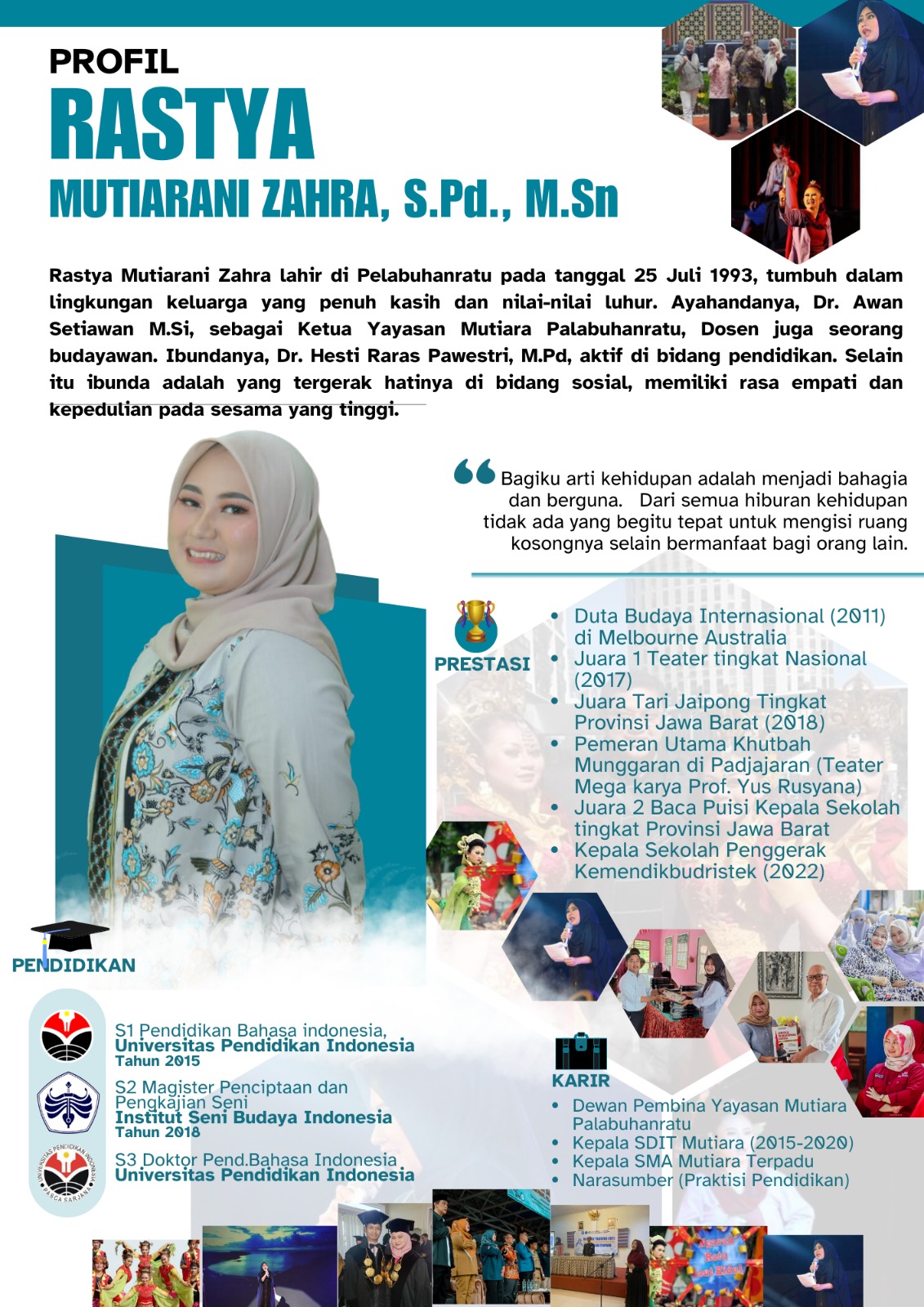 “Bagiku arti kehidupan adalah menjadi bahagia ~ dan berguna. Dari seluruh kehidupan tidak ada yang begitu tepat untuk mengisi ruang kosongnya selain menjadi bermanfaat bagi orang lain,” Dr. Hesti Raras Pawestri, M.Pd,.
