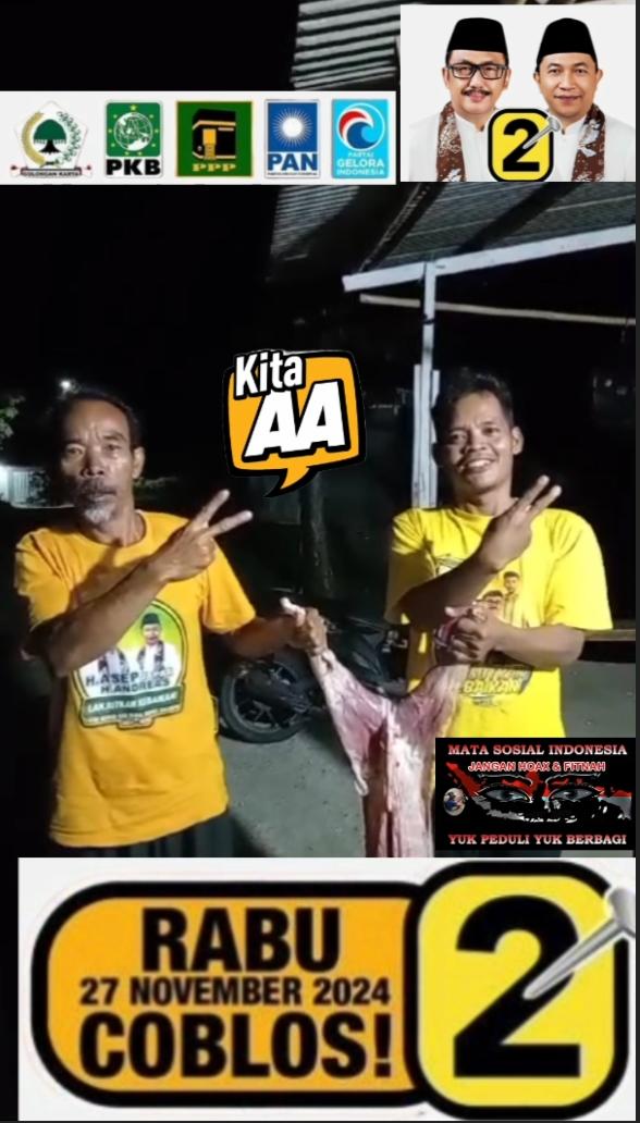“Alhamdulillah ada yang ngasih seekor kambing untuk ngaliwet, Ini rezeki yang teu diduga duga, teu ka bayang bayang acan, tiba-tiba Mang Ojom dikasih se ekor Kambing, atuh puguh we piatohen, Nanti setelah Nobar Debat Pilkada pokonya kita-kita urang ngaliwet rayakan debat pertama para calon Pilkada, jangan lupa tong poho deui dina TPS coblos Nomor Dua Asep Japar Andreas, well derededken Gasken” terangnya.
