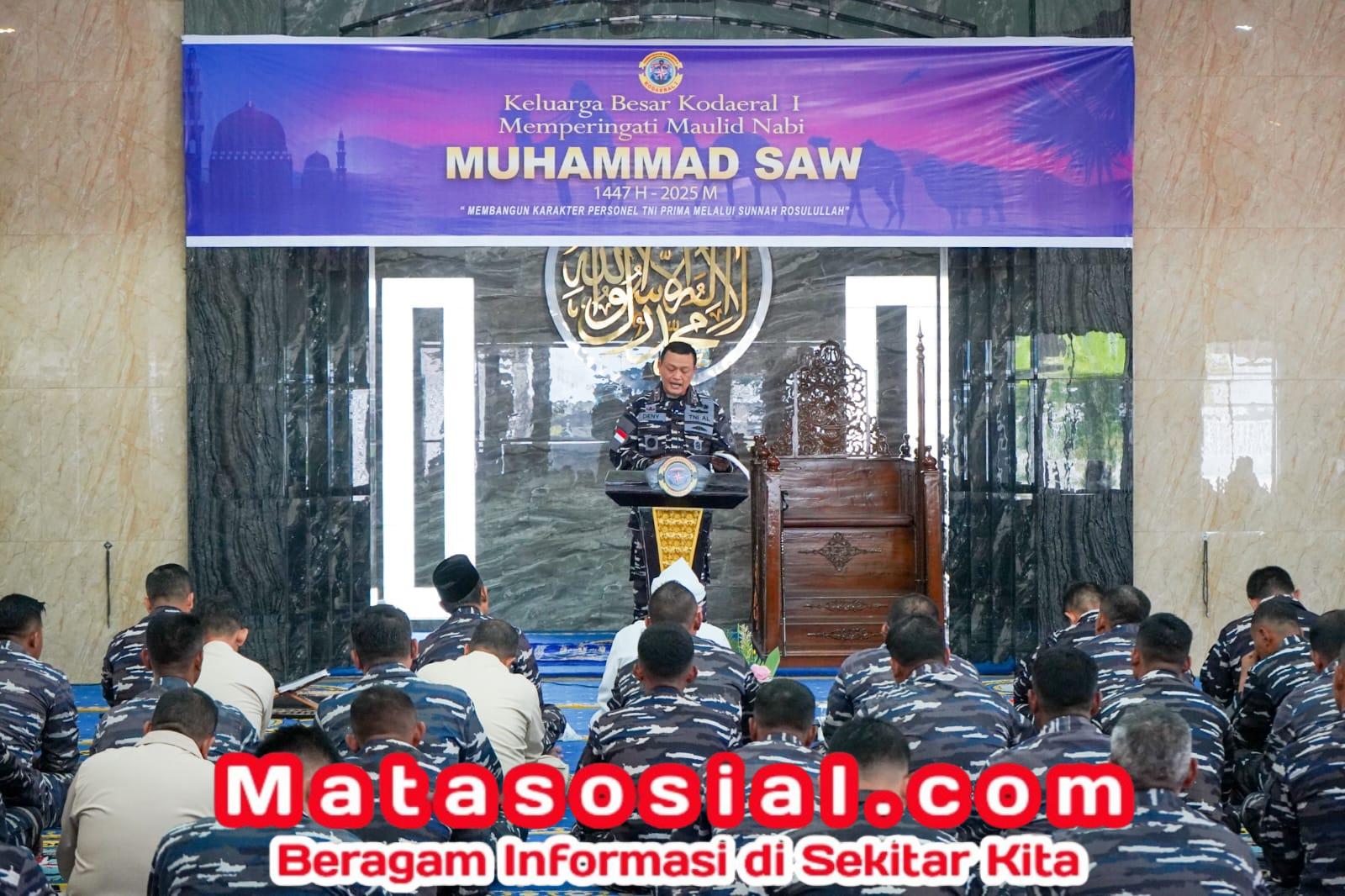 Matasosial.com,- TNI AL, Belawan,- Komandan Komando Daerah Angkatan Laut I (Kodaeral I) Laksamana Muda TNI Deny Septiana, S.I.P., M.A.P., didampingi Ketua Daerah Kodaeral I Gabungan Jalasenastri Koarmada RI Ny. Lia Deny Septiana, menghadiri acara Peringatan Maulid Nabi Muhammad SAW 1447 H/2025 M, bertempat di Masjid Al-Abrar Makodaeral I, Jalan Serma Hanafiah No.1, Belawan, Sumatera Utara, Kamis (25/09/2025).