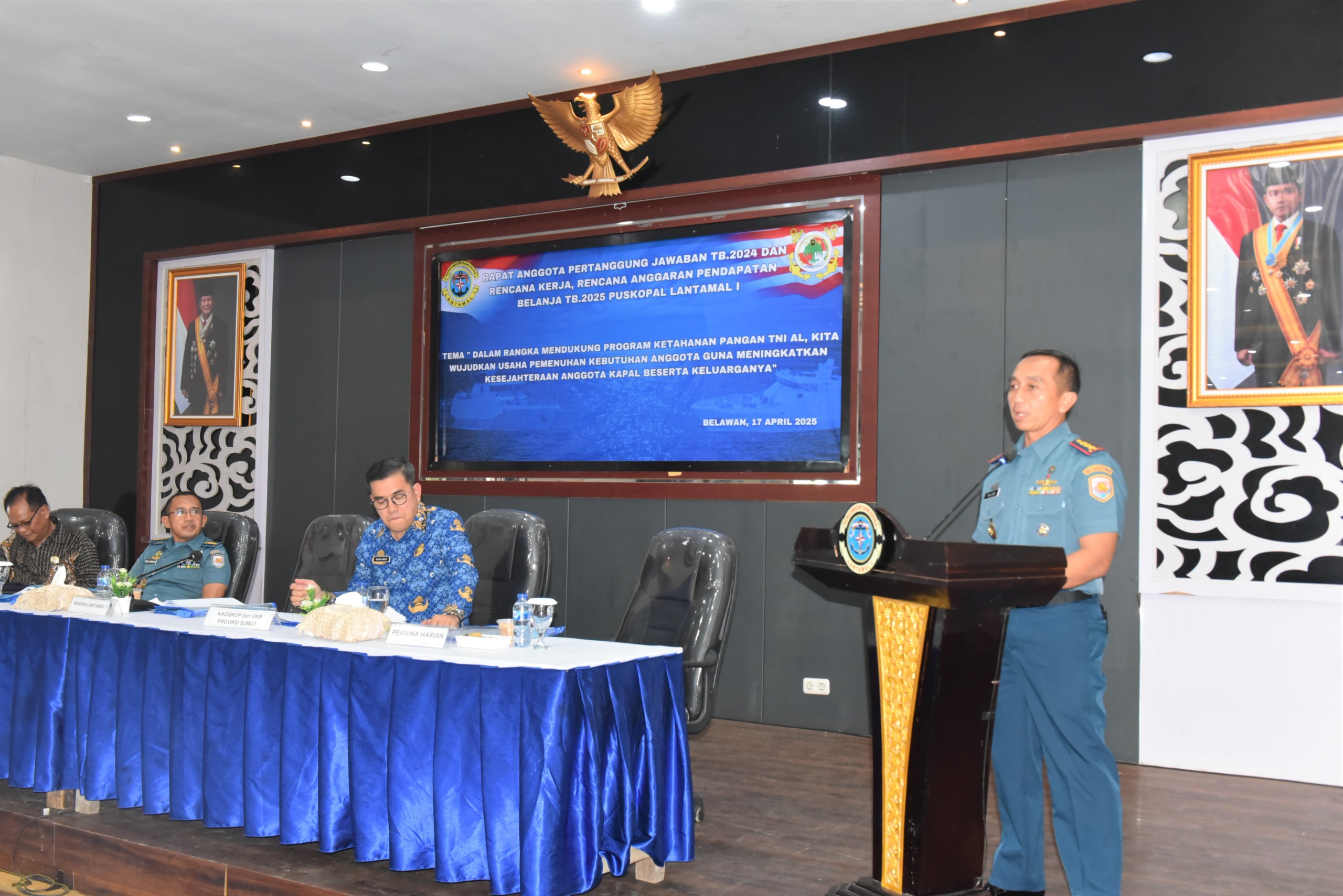 TNI AL, Belawan,- Komandan Pangkalan Utama TNI Angkatan Laut I (Danlantamal I) Brigjen TNI (Mar) Jasiman Purba, S.E., CHRMP., yang diwakili Wadan Lantamal I Kolonel Laut (P) Fajar Tri Rohadi, S.E., membuka Rapat Anggota Pertanggung Jawaban (RAPJ) TB. 2024 serta Pengesahan Rencana Kerja (RK) dan Rencana Anggaran Pendapatan Belanja (RAPB) TB. 2025 Puskopal Lantamal I, bertempat di Gedung Yos Sudarso Lantamal I, Kamis (17/4/2025).