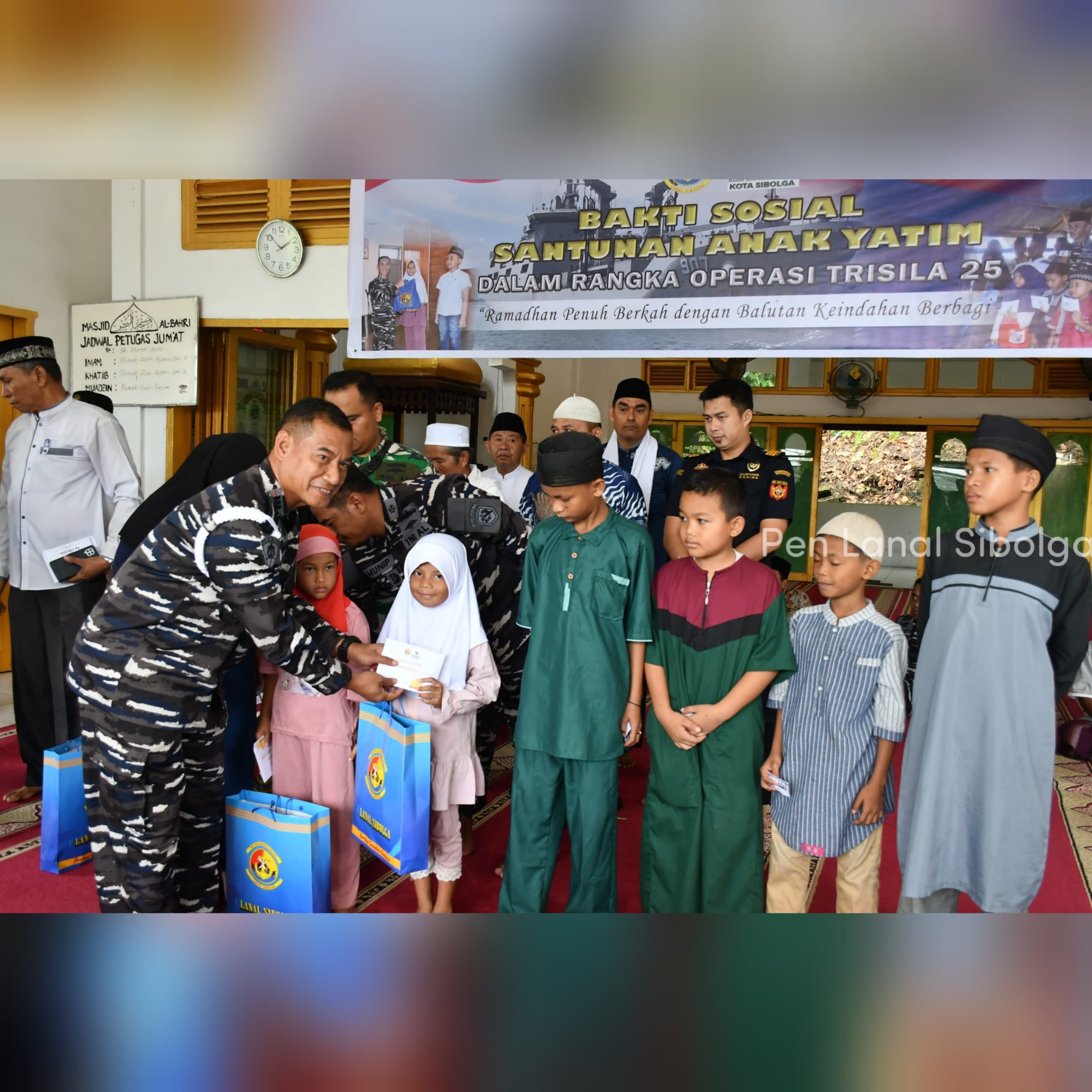 TNI AL, Sibolga,- Wakil Komandan Satuan Tugas (Wadansatgas) Trisila 2025 Kolonel Laut (P) Yusup Yanto, M.Tr. Hanla., M.M., CTMP., menunjukkan kepedulian sosialnya dengan memberikan santunan kepada 30 anak yatim di Masjid Al-Bahri, Pelabuhan Pelindo, Sibolga Sambas, Kota Sibolga, Jum’at (14/03/2025).